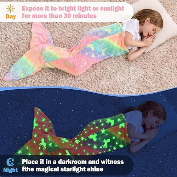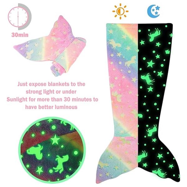 Această pătură confortabilă pentru copii cu coadă de sirenă pentru copii strălucește în întuneric atunci când este expusă la lumină!