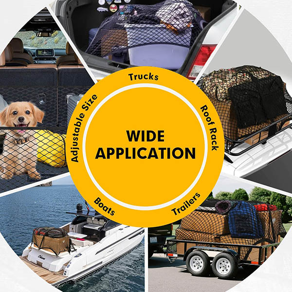 Ideală pentru cumpărăturile zilnice, călătorii în familie, accesorii pentru animale de companie, unelte, echipament de camping, echipament sportiv, jucării de plajă sau chiar pentru organizarea obiectelor libere acasă. O singură plasă — utilizări infinite. Potrivită pentru mașini, SUV-uri, autoutilitare, remorci, portbagaje de plafon și chiar bărci.