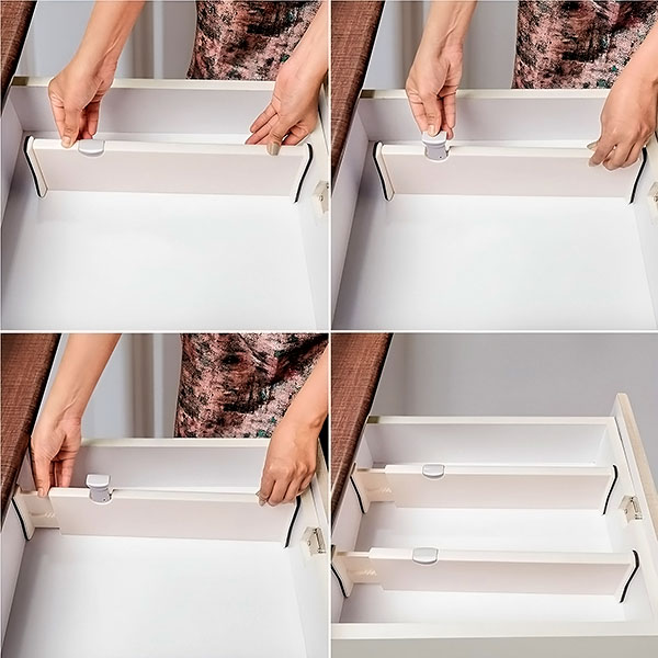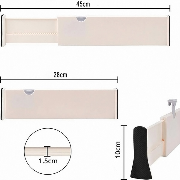 Fie că este vorba despre ustensile de bucătărie, articole de toaletă pentru baie sau șosete în dormitor, aceste separatoare se ajustează de la 28 cm la 45 cm pentru a se potrivi cu majoritatea sertarelor. Îți poți organiza spațiul exact așa cum ai nevoie.
