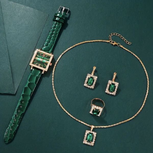 Acest ansamblu șic prezintă ceasuri cu cuarț cu ecran pătrat de epocă în nuanțe verzi izbitoare, completate de un set de bijuterii cu pietre strălucitoare, permițându-vă atât să vă îmbunătățiți propriul stil, cât și să împărtășiți eleganța cu cei dragi. 🎁⌚💚